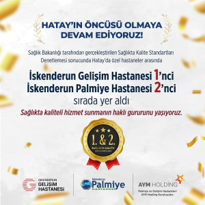 İskenderun Gelişim Hastanesi, Sağlık Bakanlığı tarafından yapılan Sağlıkta Kalite Standartları değerlendirmesinde; 100 üzerinden 97,58 alarak Hatay’daki özel hastaneler arasında en yüksek puanla birinci olurken, İskenderun Palmiye Hastanesi ise 96,23 puan alarak ikinci oldu.
