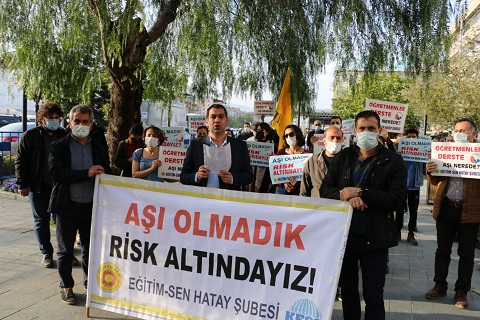 Eğitim-Sen Hatay Şube Başkanı Özgür Tıraş, Öğretmen camiasının koronavirüse kurban dilmemesi için bir an önce haftalık testlerin ve koronavirüs aşılarının temin edilerek öğretmenlere uygulanmasını istedi.