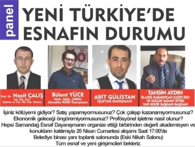 Samandağ Esnaf Dayanışma Platformu tarafından Yeni Türkiye’de Esnafın Durumu konulu Panel, 20 Nisan 2019 Cumartesi günü saat 17.00’da gerçekleşecek.