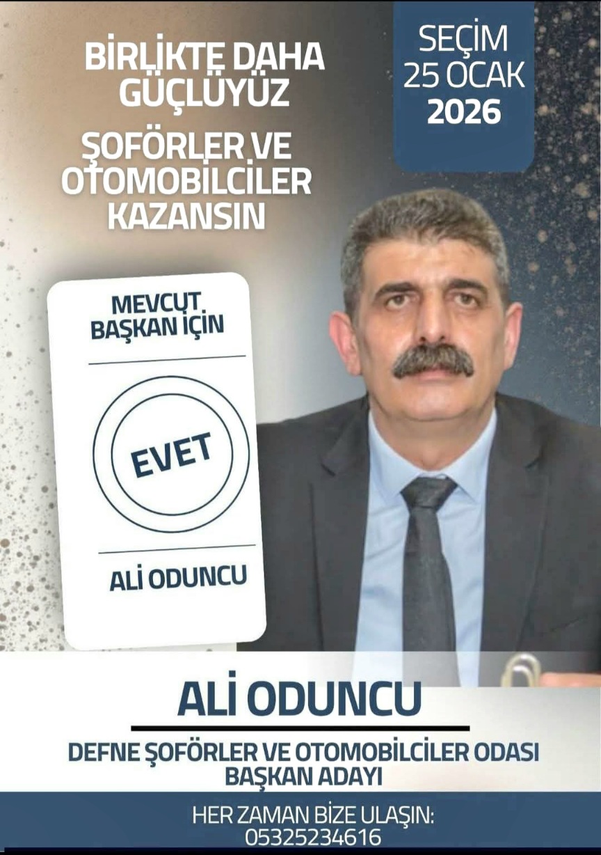 Defne Şoförler ve Otomobilciler Odası Başkan Adayı Ali Oduncu, 25 Ocak 2026 tarihinde gerçekleştirilecek olağan genel kurul öncesinde şoför esnafına seslendi. Oduncu, görev süresi boyunca esnafın sorunlarını merkeze alan, çözüm odaklı ve kurumsal bir anlayışla çalıştıklarını belirterek, aynı hizmet çizgisini sürdürmek amacıyla yeniden aday olduğunu açıkladı.