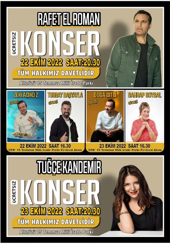 6. Altınözü Zeytin, Zeytinyağı ve Gastronomi Festivali’nin birbirinden coşkulu görüntülere ev sahipliği yapacağını belirten Altınözü Belediye Başkanı Rıfat Sarı, “Belediyemiz ve Kaymakamlığımız organizasyonu ile 22-23 Ekim 2021 tarihleri arasında düzenleyeceğimiz 6’ıncı Altınözü Zeytin, Zeytinyağı ve Gastronomi Festivali’ne tüm halkımız davetlidir. Tüm hemşehrilerimizi dolu dolu geçecek ve birbirinden renkli görüntülere sahne olacak festivalimize bekliyoruz” sözlerini kullandı.