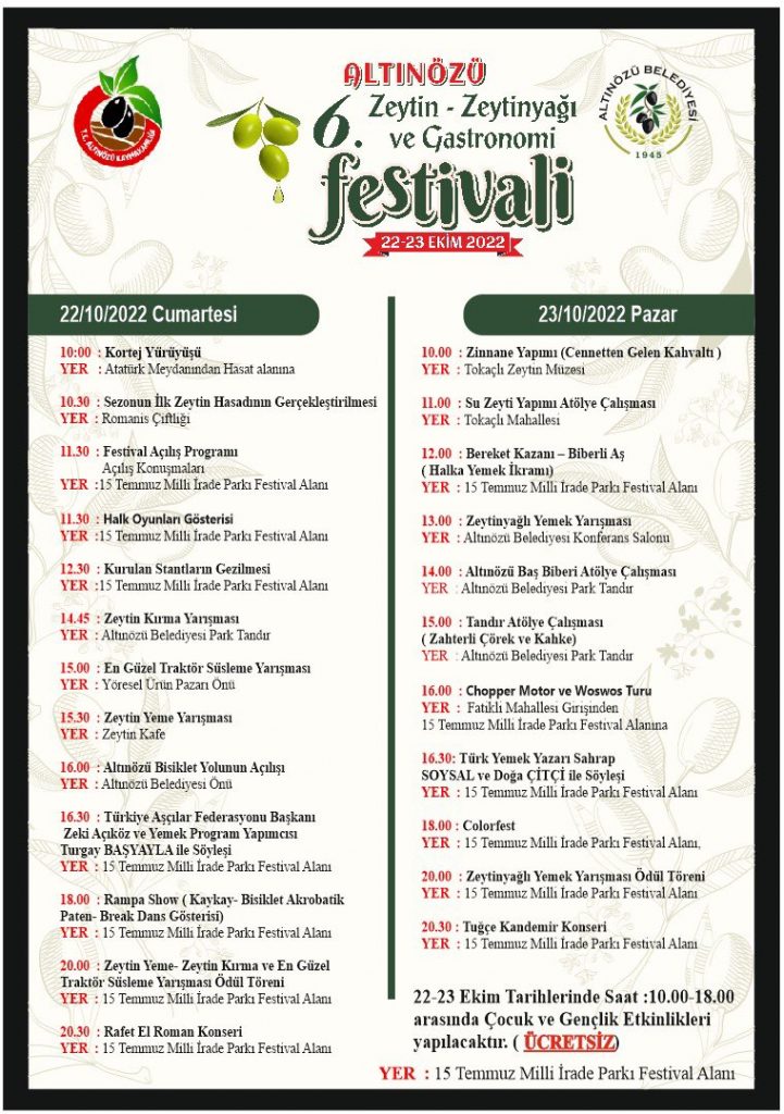 Zeytin Diyarı Altınözü’nde 22-23 Ekim tarihlerinde Altınözü Zeytin, Zeytinyağı ve Gastronomi Festivali’nin 6’ıncısı düzenlenecek.