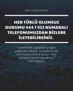Arsuz Belediyesi’nden yapılan açıklamada; “İlçemizde yaşanan yoğun yağıştan dolayı oluşabilecek olumsuzluklara karşı, tüm ekiplerimizle teyakkuz halindeyiz.