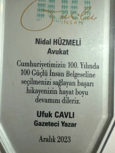 AV. NİDAL HÜZMELİ’YE 100 GÜÇLÜ İNSAN BAŞARI ÖDÜLÜ VERİLDİ