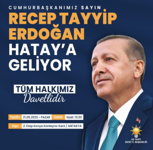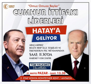 21 Mayıs pazar günü saat 13:30’da Antakya 2. Etap Konya Konteyner Kent’e gerçekleşecek ziyaret programı ile ilgili açıklama yapan Başkan İbrahim Gül:”Hatay’ımıza teşrif edecek olan Cumhur İttifakı Liderlerimiz, Cumhurbaşkanımız Sayın Recep Tayyip Erdoğan ve Bilge Liderimiz Sayın Devlet Bahçeli’nin katılacağı ziyaret programına, tüm halkımız davetlidir”dedi.