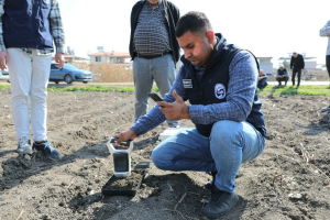 HBB Tarımsal Hizmetler Dairesi Başkanlığı yüksek ziraat mühendisleri kontrolünde 2 toprak analizi makinesiyle toprak yapısına yönelik incelemelerde bulunuyor.