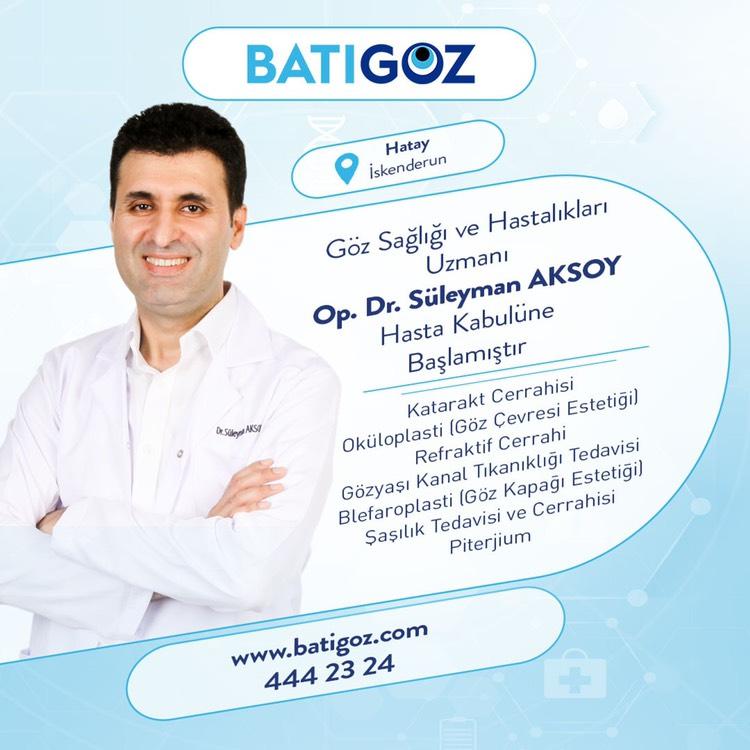 Göz Sağlığı ve Hastalıkları Uzmanı Op. Dr. Süleyman Aksoy, Batıgöz Hastanesi’nde hasta kabulüne başladı. Aksoy, katarakt cerahisi, oküloplasti (göz çevresi estetiği), refraktif cerrahi, gözyaşı kanal tıkanıklığı tedavisi, blefaroplasti (göz kapağı estetiği), şaşılık tedavisi ve cerrahisi, piterjium alanlarında hasta kabulüne başlayan Aksoy’dan randevu almak için 444 23 24 numaralı telefonu aramanız yeterli olacaktır. İskenderun Batıgöz Hastanesi Mustafa Kemal Mah. Eyyüp Sultan Cad. No.79 İskenderun Hatay adresinde hizmet vermeye devam ediyor.