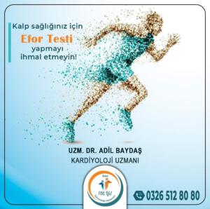 Efor testi en çok kalp damar hastalığı (kalbi besleyen atardamarlarda darlık veya tıkanıklık olması) tanısının koyulması ya da bu tanı koyulmuş hastaların takibi için yapılmaktadır. Sporcuların düzenli aralıklarla yaptırması gereken bu test uzman hekimlerin teşhis koyması konusunda oldukça önemli bir işlemdir. Bilgi için 0326 512 80 80 numaralı telefonu arayabilirsiniz” ifadelerini kullandı.