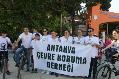 Büyükşehir yöneticileri ile birlikte Antakya Çevre Koruma Derneği ve Hatay Bisikletliler Topluluğu üyelerinin de katıldığı bisiklet turu Doğuş Okulları önünde başlayarak kentin merkezi noktalarında devam etti.