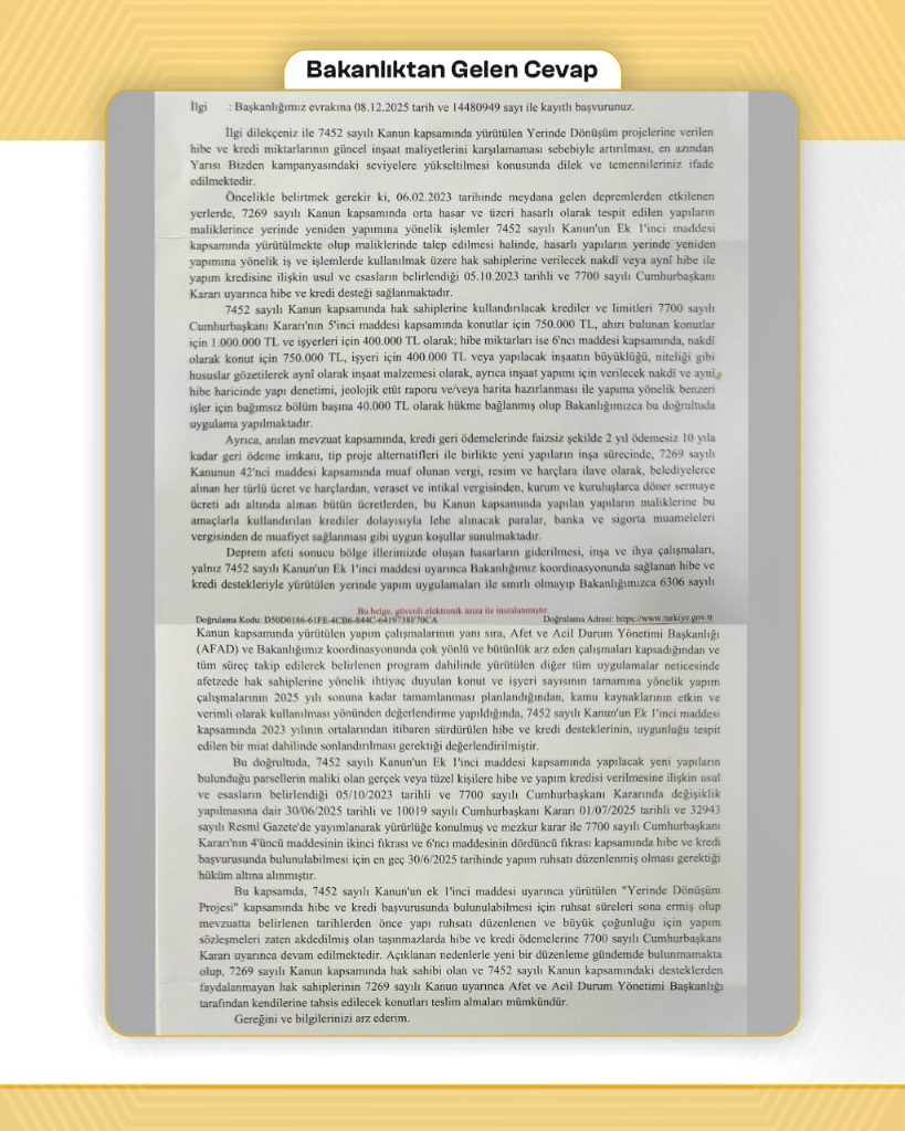 Bakanlıktan gelen yazılı yanıtta ise, Yerinde Dönüşüm desteklerinin 7452 sayılı Kanun ve ilgili Cumhurbaşkanı Kararları çerçevesinde mevcut haliyle sürdüğü belirtilerek, yeni bir düzenlemenin gündemde olmadığı bildirildi.