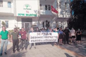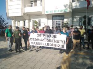 Değişim Hareketi öncüleri konuyla ilgili bir protesto gösterisi düzenlediler. Düzenlenen protesto gösterisinde bir basın açıklaması yapıldı. Açıklamada, “Defne Belediye yönetimi yaklaşık bir ay önce aldığı bir karar ile 31 Ağustos’ta 12 parsel için kiralama ihalesine gidilecektir. Öncelikli talebimiz; Harbiye Darmaşta bölgesinde yer alan 11 parsel ve Çekmece Mahallesinde yer alan 1 parsel olmak üzere açık arttırmaya çıkarılan 12 parsel için 31 Ağustos Salı günü yapılacak olan ihalenin iptal edilmesidir. Defne’nin birilerine peşkeş çekilmesine karşı duracağız. Halkın mallarına göz koyanlar, halkın sırtından geçinenler, Defneli olamaz, bunlar olsa olsa Defne’yi iliklerine kadar sömüren, Defne halkını kandıran Defne düşmanlarıdır. Öyle olmasa çocuklarımıza yaşanılabilir bir Defne bırakmak yerine Defne ilçemiz para babalarına peşkeş çekilir miydi. Yeşile dair ne varsa betonlaştıran, ucubeleştiren bir Defne belediye yönetimi ile karşı karşıyayız. Rant uğruna Belediye Meclis’inde çıkarılan kararlar, birileri istedi diye halka sorulmadan alınan kararlar. Bu kararlarda kimin imzası varsa hepsi Defne halkının düşmanlarıdır. Maalesef görülüyor ki; Defne Belediye Başkanı İbrahim Güzel’in ve bazı Belediye Meclis üyelerinin Belediye yönetiminden anladıkları şey; Belediyenin taşınmazlarını peşkeş çekmek, kişiye özel ihaleler yapmak ve imar ile ilgili çıkar amaçlı kararlar almaktır. Defne halkımız; Uçuruma doğru hızla giden bir Defne Belediye yönetimini görüyoruz. Doğru, hızlı ve yerinde müdahaleler olmazsa, ne yazık ki Defne’nin gidişatı çokta iyi görünmüyor. Tüm bu gidişe dur diyebilecek, sese ihtiyacımız var ve bu ses kapalı kapılar ardında değil alanda çıkan ses olan Defne Değişim Hareketidir. Defne Belediyesi Defne Halkının aklıyla alay ediyor!