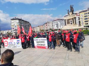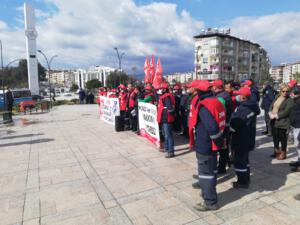 Ekonomik gelişmeler belediye gelir ve giderlerini de olumsuz etkilemiştir. Merkezi idareden farklı olarak yerel yönetimler daha kısıtlı ve belirli kaynaklarla yönetilmektedir. Son yıllarda hizmetlerin merkezden yerele kayma politikası ile beraber birçok kamu hizmeti yerel yönetimler olan belediyeler eliyle yerine getiriliyor. Belediyelerin sorumluluk ve yetki alanları genişlerken kaynaklar aynı oranda büyümüyor. Belediyelere ayrılan merkezi bütçe kaynakları acilen arttırılmalı, işçi ücretleri konusunda merkezi bütçeden belediyelere doğrudan pay ayrılmalıdır. Ayrıca 5393 sayılı Belediyeler Kanunu’nda öngörülen bütçedeki %30 ve %40 personel harcama giderleri sınırlaması kaldırılmalı ya da daha gerçekçi bir orana yükseltilmelidir. Belediye işçilerinin sesi olan DİSK/Genel-İş, bugün buradan ilan ettiği talepleri bundan sonra yurdun dört bir yanına daha güçlü taşımaya kararlıdır. Gelin bu mücadeleyi hep birlikte verelim. Gelin sesimizi hep birlikte yükseltelim. Hükümet ve belediye işverenleri belediye işçilerinin bu sesine kulak vermelidir. Belediye işçileri de kamu işçisidir, bu nedenle; Belediye şirket işçilerine kadro ve ilave tediye hakkı istiyoruz. Taşerondan kadroya geçen işçiler zorunlu emekli edilmesin istiyoruz. Belediye gelirlerinin arttırılmasını, personel gideri sınırlamalarının kaldırılmasını istiyoruz. Yaşasın işçi sınıfının birlik, mücadele ve dayanışması” ifadelerini kullandı.