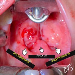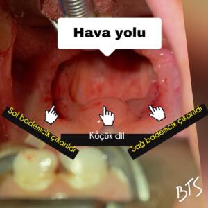 Birinci görselde bademciklerindeki büyüklük sebebiyle havayolu tamamen kapanan bir hasta görülmektedir. Sonraki görselde bademcikler çıkarıldıktan sonra havayolunun nasıl açıldığı izlenmektedir.