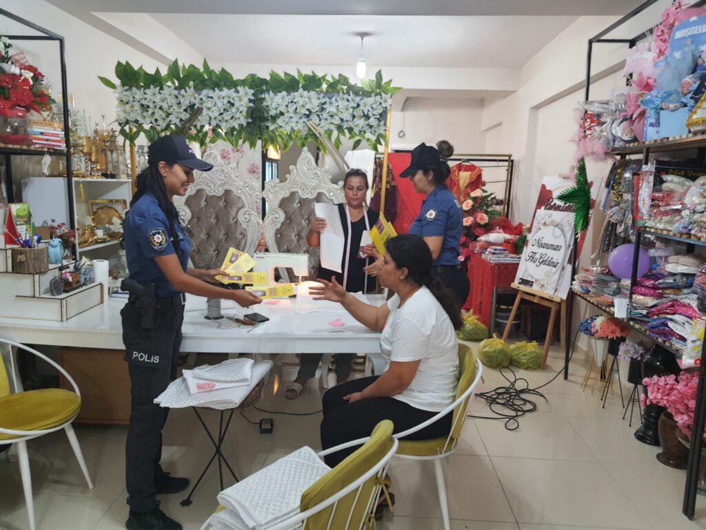 Hatay Polisi, “Kadına El Kalkamaz” mottosu çerçevesinde, çarşı, Pazar ve işyerlerini gezerek broşür dağıtmayı sürdürüyor.
