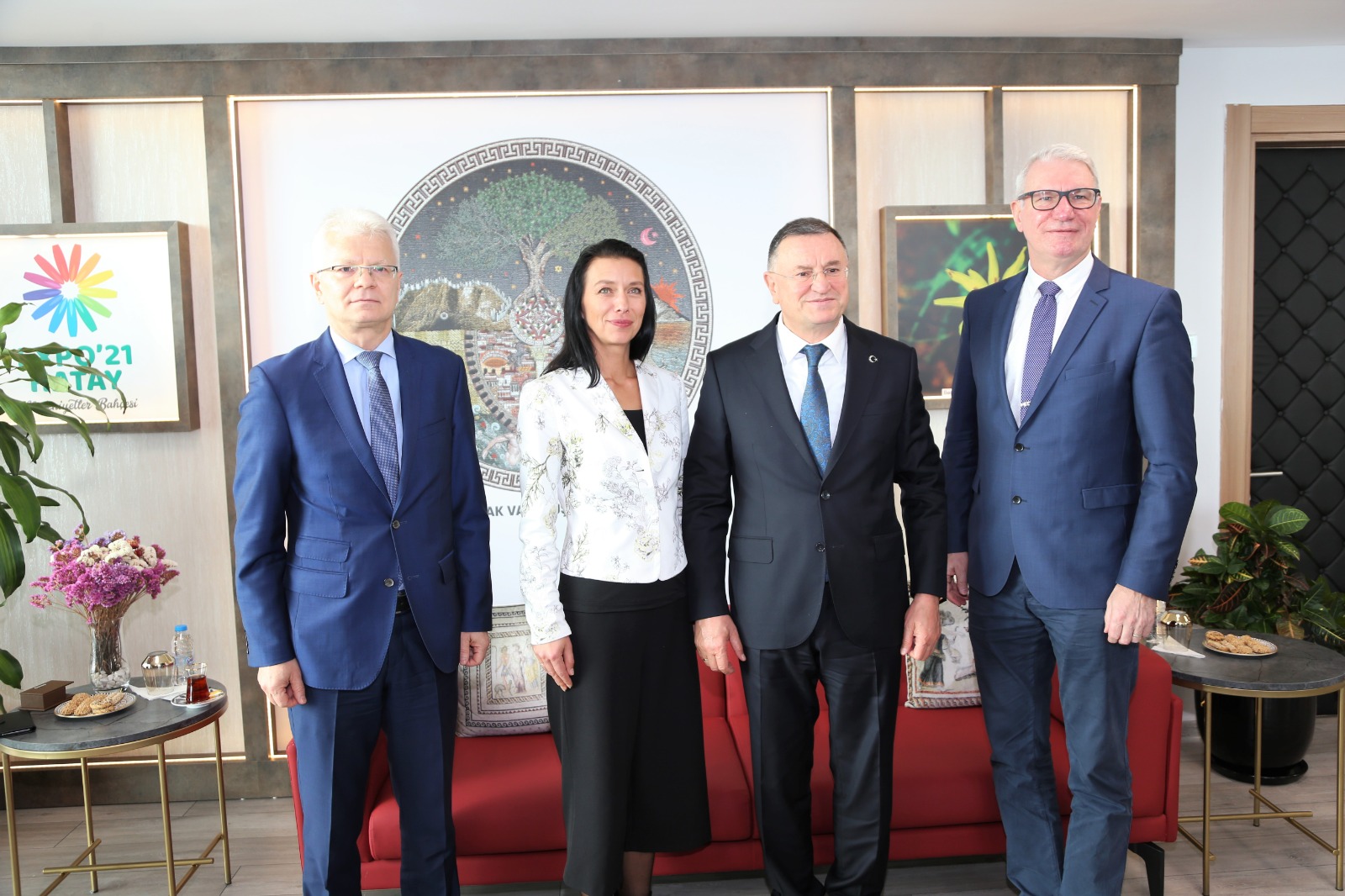 Hatay Büyükşehir Belediye Başkanı Doç. Dr. Lütfü Savaş, Litvanya Büyükelçisi Ricardas Degutis, Letonya Büyükelçisi Peteris Vaivars ve Estonya Büyükelçisi Annely Kolk’u EXPO 2021 Hatay’daki çalışma ofi...