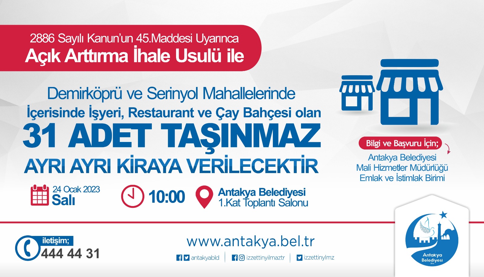 Antakya Belediyesi, mülkiyetinde bulunan 31 taşınmazı 24 Ocak 2023 Salı günü saat 10.00’da Antakya Belediyesi 1. Kat Encümen Toplantı Salonu’nda açık artırma ihale usulü ile kiraya verecektir....