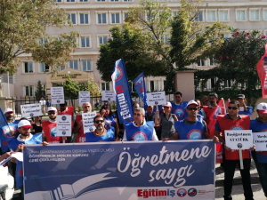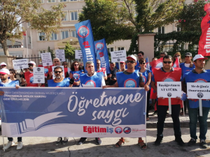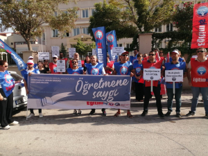 Eğitim-İş Hatay 1 Nolu Şubesi, Hatay Milli Eğitim Müdürlüğü önünde öğretmene saygı eylemi gerçekleştirdi.