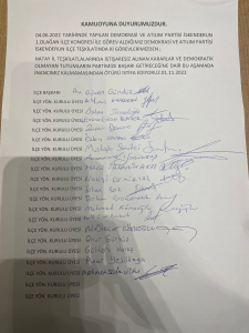 04.06.2022 Tarihinde 1.Olağan Kongremizi gerçekleştirerek İskenderun’da her biri birbirinden değerli aydınlık bir Türkiye hayalleri kuran yol arkadaşlarım ile yönetimimi oluşturarak bugüne kadar var gücümüzle çalışmaya devam ettim. Partimiz içerisinde yaşanan ve ne kadar dile getirdiysek de çözümü yönünde atılan adımların ortak akıl ve istişare kültüründen uzak kaldığını fark etmiş olmamdan ötürü 01.11.2022 tarihinde Yönetim Kurulu ile yapmış olduğum istişare gereği olarak Kurucu İlçe Yönetimimizle birlikte teşkilat görevlerimizden İSTİFA ETMİŞ BULUNMAKTAYIM.