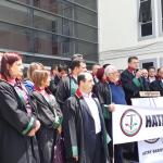 Hatay Barosu Avukatları Hatay Adliyesi önünde toplandı. Avukatlar burada Hatay Barosu yazılı pankartı açtı ve alınan kararı alkışlarla protesto etti.