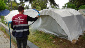 HBB Sağlık ve Sosyal Hizmetler Daire Başkanlığına bağlı İlaçlama Birimi, havaların ısınmasıyla Hatay’ın risk oluşturan bölgelerinde, çadırkent ve konteyner kentlerde çalışmalarını yoğunlaştırdı.