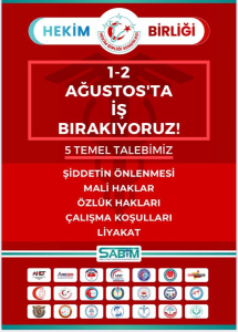 Hekim Birliği Sendikası Genel Başkan Yardımcısı ve SABİM Dönem Sözcüsü Dr. Yakup Gökhan Doğramacı, “Hekimler, hemşireler, ebeler gibi hiçbir sağlık ve sosyal hizmet çalışanının, mevcut sistem içerisinde hizmet sunabilecek tahammülü kalmamıştır. Taleplerimizi dile getirme amaçlı ilk iş bırakma eylemimiz, 7. Dönem Toplu Sözleşme görüşmelerinin başlayacağı 1 ve 2 Ağustos 2023 tarihlerinde gerçekleşecektir. Her iş bırakma eylemimizde olduğu gibi poliklinik hizmeti gibi elektif hizmetler verilmeyecek, ancak acil durumlar iş bırakma eyleminden muaf tutulacaktır” açıklamasını yaptı.