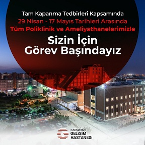 Tam kapasite olarak hizmet verecek olan İskenderun Gelişim Hastanesi tarafından yapılan açıklamada, “Tam kapanma tedbirleri kapsamında 29 Nisan – 17 Mayıs tarihleri arasında tüm poliklinik, ameliyathane ve doğumhanelerimizle sizin için görev başındayız. Detaylı Bilgi ve Randevu. 0850 304 66 66” denildi.