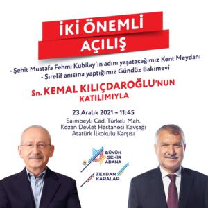 23 Aralık’ta, saat 11.45’te gerçekleştirilecek program öncesi köy kahvehanelerinde halka hitap eden Başkan Zeydan Karalar, “Ulusal kurtuluş mücadelesinde Ermenilere ve Fransızlara karşı ciddi direnişin olduğu bir yer burası. Zulme rağmen kahramanca mücadele eden Kozan, Adana ile birlikte ilk kurtulan yerleşim bölgelerindendir. Bu Türkiye’nin kurtuluşunu da tetiklemiştir. Kozanlıların Mustafa Kemal Atatürk’e ve kurduğu Cumhuriyete bağlılığını biliyorum. Şehit Kubilay’ın Kozanlı olması çok önemli. Onun adına Kent Meydanı, anıt ve park yaptık. Kozanlı Kurtuluş Savaşı Kahramanı Sırelif adına da Gündüz Bakımevi yaptık. Açılışlara CHP Genel Başkanımız gelecek. Muhteşem bir kalabalıkla onu karşılayalım” diye konuştu.