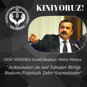 Konu ile ilgili bir açıklama yapan YENİ SENDİKA Genel Başkanı Metin Memiş, “Bizler YENİ SENDİKA olarak vatanına ve milletine sahip çıkan sağlık çalışanlarımızı temsil etmekteyiz. Bizim mesai arkadaşlarımız, sınır ötesi operasyonlarda Mehmetçik ile birlikte omuz omuza mücadele etmektedir. Kimi zaman Mehmetçik, bizim hekimlerimizin kollarında şehadet şerbeti içmektedir. Tabipler Birliği’nin başındaki terörist sevici hekim ise devletimize, milletimize, ordumuza, askerimize hakaret edercesine son derece çirkin bir şekilde teröristlerin etkisiz hale getirilmesinde kimyasal silah kullanıldığı iftirasını atmaktadır. Bu haliyle Tabipler Birliği Başkanı aslında bizzat kendisi fizyolojik zehir saçmaktadır” dedi.