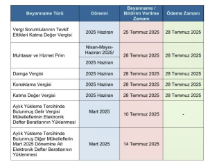Aşağıda, 2025 yılı Haziran dönemine ait beyanname ve bildirimlerin tamamının 28 Temmuz 2025’e denk geldiği görülüyor: