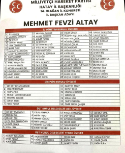 Hatay Milliyetçi Hareket Partisi 14.Olağan İl Kongresi yoğun katılım ile gerçekleşirken tek liste ile seçime gidilen kongrede mevcut başkan Mehmet Fevzi Altay yeniden başkanlığa seçilerek güven tazeledi.