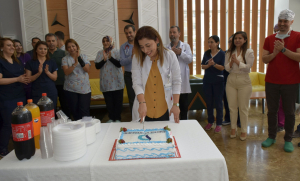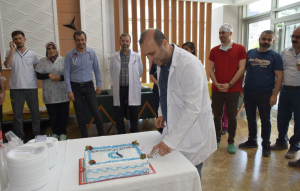 Pastayı Hastane başhemşiresi ve yeni katılan Nöroloji Uzm. Dr. Faruk Mavruk birlikte kestiler. Pasta kesiminden sonra hemşirelere Baştabip Dr. Şefikoğulları tarafından çiçek dağıtıldı.