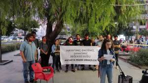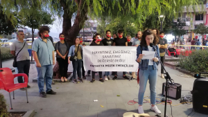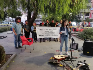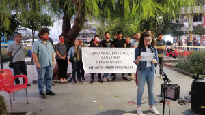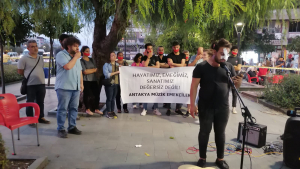 Antakya Künefeciler Meydanı’nda toplanan Antakya Müzik Emekçileri adına Mihriban Randa yaptığı açıklamada; “Bir arada olarak, kenetlenerek, dayanışarak bu saldırıların üstesinden geleceğiz. Türkiye’de müzisyenlere yönelik baskılar gün geçtikçe artıyor.