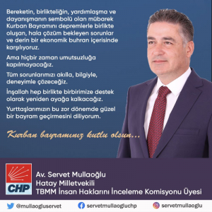 CHP Hatay Milletvekili ve TBBM İnsan Haklarını İnceleme Komisyonu üyesi Av. Servet Mullaoğlu mübarek Kurban Bayramı ile ilgili kutlama mesajı yayımladı.
