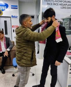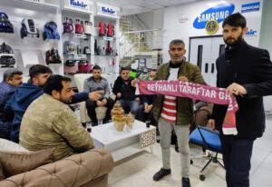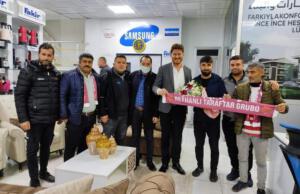 Taraftar grubu temsilcilerini işyerinde ağırlayan Suvaroğlu’na teşekkür eden taraftarlar, kulüp atkısı da hediye ettiler.