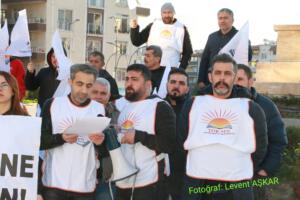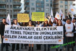 Tüm Öğretmenler Birliği Sendikası Hatay Şubesi Yönetim Kurulu Üyeleri, özeleştirilen şirketlerin yeniden kamu tarafından alınmasını ve halka yüklenen zamların sona ermesini istediler.