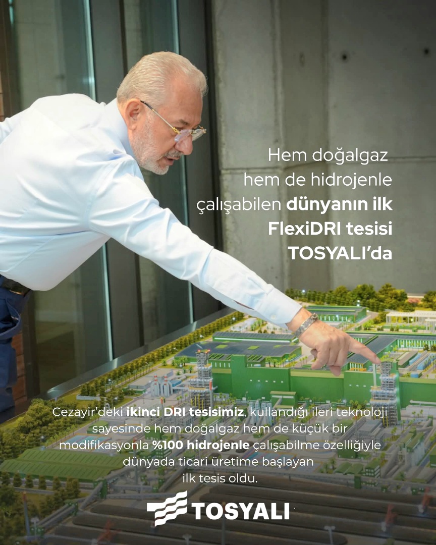 Tosyalı Holding, Cezayir’de devreye aldığı ikinci DRI tesisiyle çelik sektöründe bir ilke imza attı. Hem doğalgaz hem de küçük bir modifikasyonla yüzde 100 hidrojenle çalışabilen tesis, dünyada ticari üretime başlayan ilk FlexiDRI tesisi olurken, şirketi yeşil çelik dönüşümünde küresel ölçekte öncü konuma taşıdı.