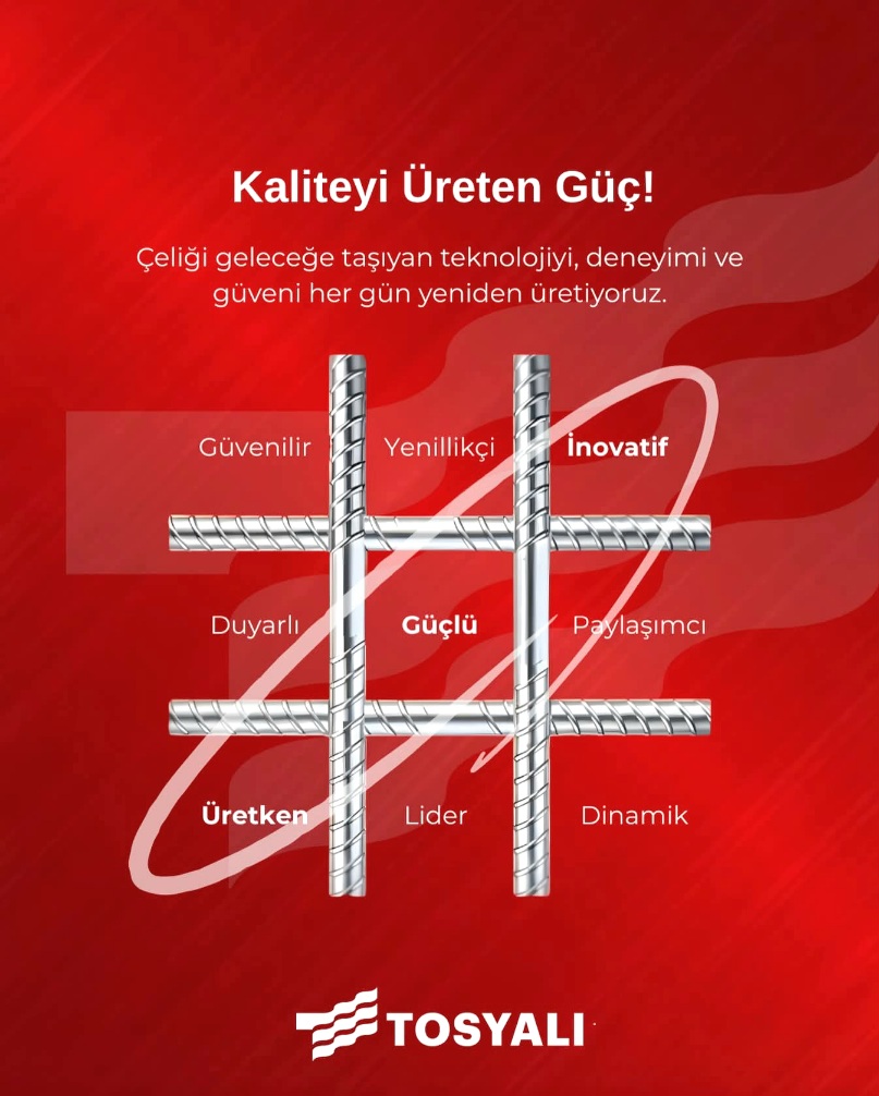 Tosyalı, çeliği geleceğe taşıyan gücünü sadece üretim kapasitesinden değil, benimsediği kurumsal değerlerden alıyor. Kaliteyi üretimin merkezine yerleştiren şirket, güvenilir ve dayanıklı çözümler sunarak sektörde fark yaratıyor. Üretkenlik, istikrar ve sorumluluk anlayışı Tosyalı’nın temel yapı taşları arasında yer alıyor.