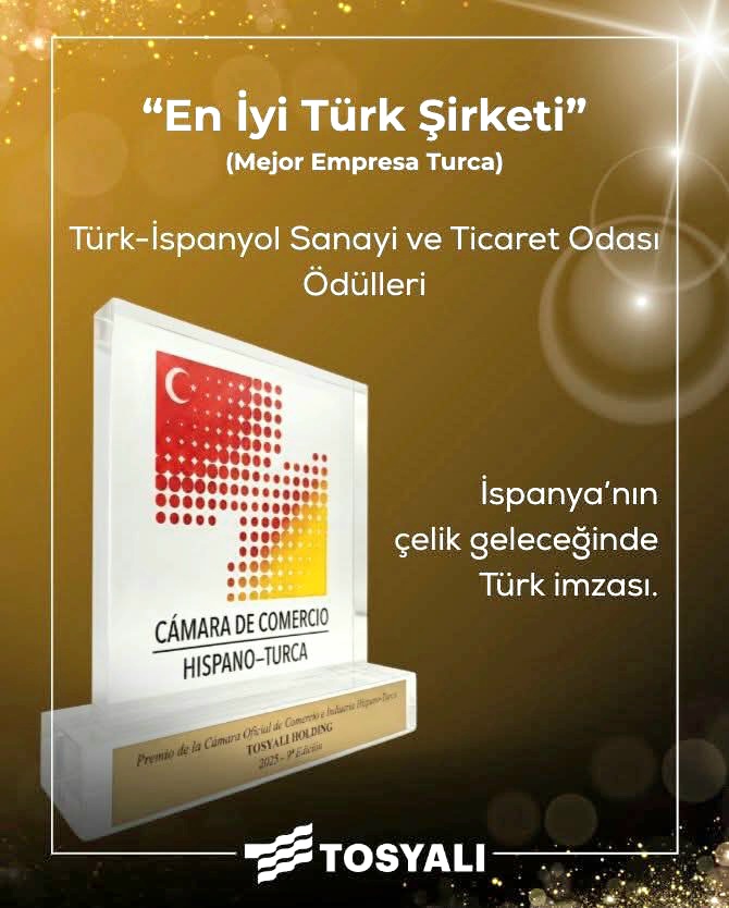 Tosyalı, Türk-İspanyol Sanayi ve Ticaret Odası tarafından düzenlenen IX. Ödül Töreni’nde “En İyi Türk Şirketi” seçilerek uluslararası alandaki güçlü konumunu bir kez daha tescilledi. Şirket, Avrupa’daki etkinliğini sürdürülebilirlik, verimlilik ve yenilikçilik odaklı iş yapış modeliyle daha da ileri taşımayı hedefliyor.