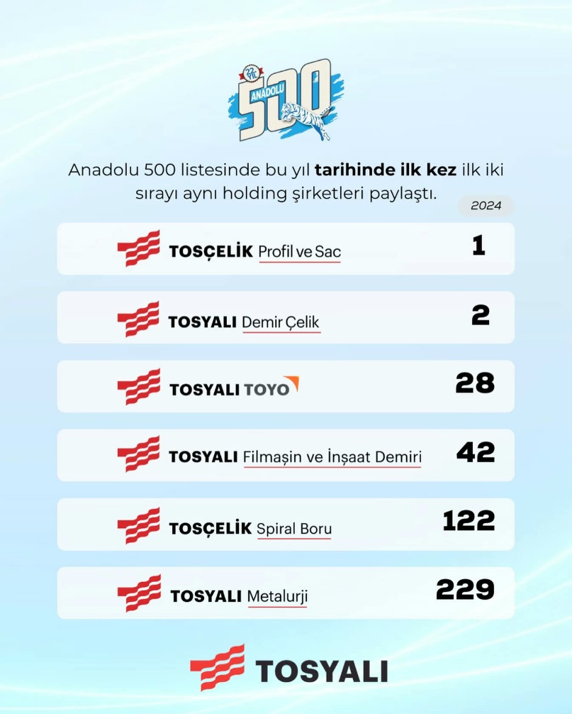 Tosyalı, sanayi dünyasının önemli göstergelerinden biri olan Anadolu 500 listesinde tarihi bir başarıya imza attı. Liste tarihinde ilk kez ilk iki sırayı aynı holding bünyesindeki şirketler paylaştı.