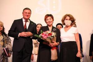 Konser sonunda Başkan Lütfü Savaş, koro şefi Kuttybadamova ve koro üyelerine bu anlamlı resital için çiçek hediye etti.