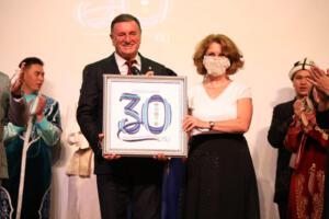 Koro üyeleri de misafirperverliği ve Türk dünyasına yaptığı katkılardan dolayı özel olarak hazırlanan ve bağımsızlıklarının 30. yılını simgeleyen tabloyu Lütfü Savaş’a takdim etti.
