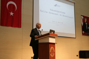 Programda daha sonra Yükseköğretim Kalite Kurulu Başkanı Prof. Dr. Muhsin Kar “Yükseköğretimde Kalite Güvencesi ve Akreditasyon” konulu bir konferans verdi. YÖKAK Başkanı Prof. Dr. Kar yapmış olduğu sunumda öncelikle kalite güvencesinin artan önemine ve modern bir kavram olarak kalite kavramına değindi. Kalitenin çok boyutlu bir kavram olduğunun altını çizen YÖKAK Başkanı Prof. Dr. Kar, nitelik farklılıklarının artmasının kalite kavramının öneminin artışına neden olduğunu belirtti.